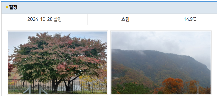 지도를 통해 전국 단풍 현황을 시각적으로 한눈에 볼 수 있으며, 특정 산을 선택해 단풍 사진도 함께 확인할 수 있습니다. 단풍 상태는 기상청에서 지속적으로 업데이트되기 때문에 가장 최신 정보를 얻을 수 있습니다.