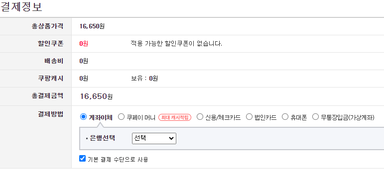 - 쿠팡 캐시 적립 불가: 계좌 이체로 결제할 경우 쿠팡 캐시 적립이 불가합니다.