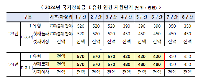2024년 국가장학금 지원구간별 장학금 한도