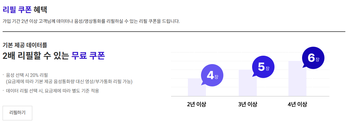 5년 이상 고객은 가입 연수에 따라 매년 1GB 단위 데이터 제공(최대 30GB), 10년 이상 고객은 공연 할인, 이모티콘 추첨 등 다양한 혜택을 누릴 수 있습니다.